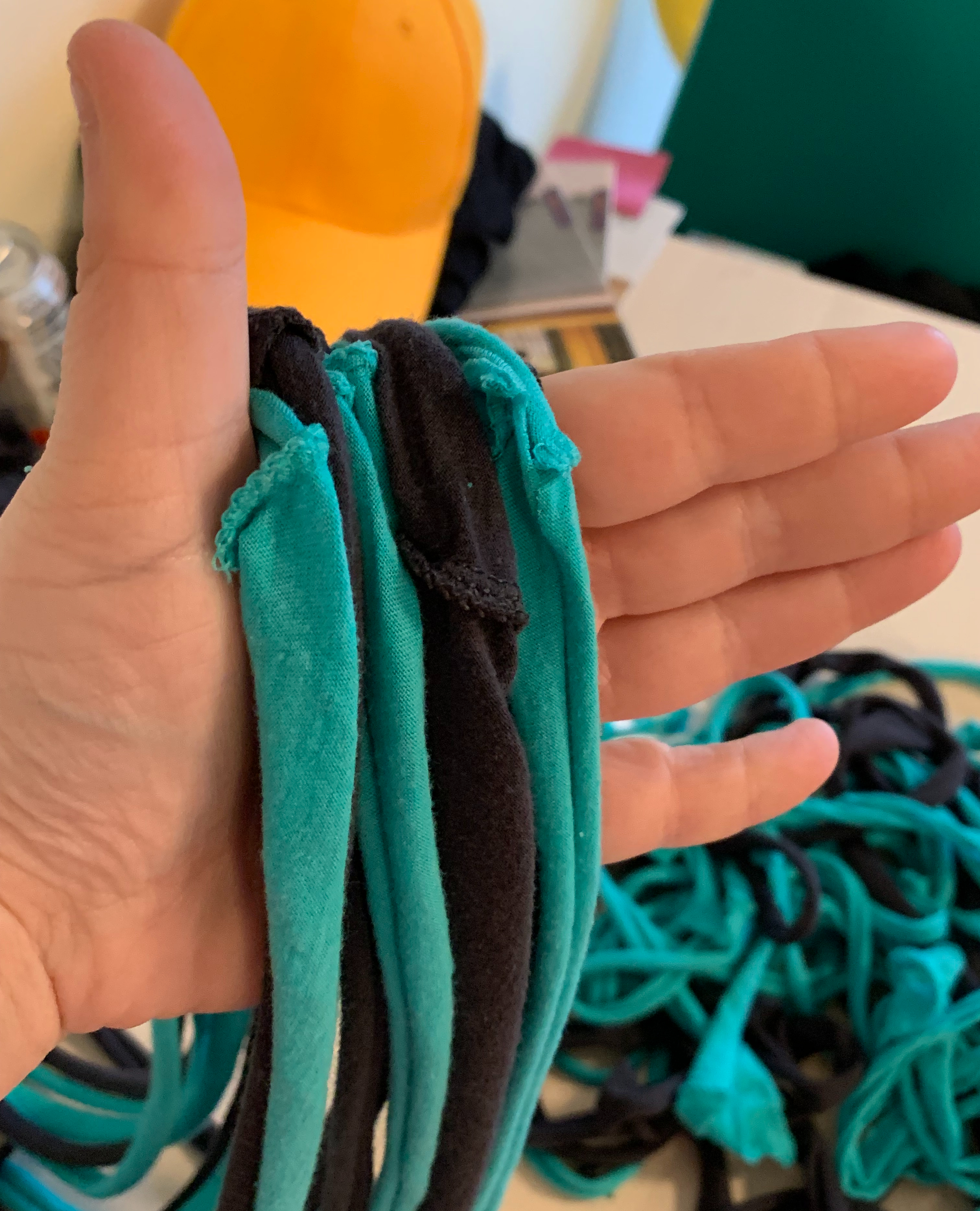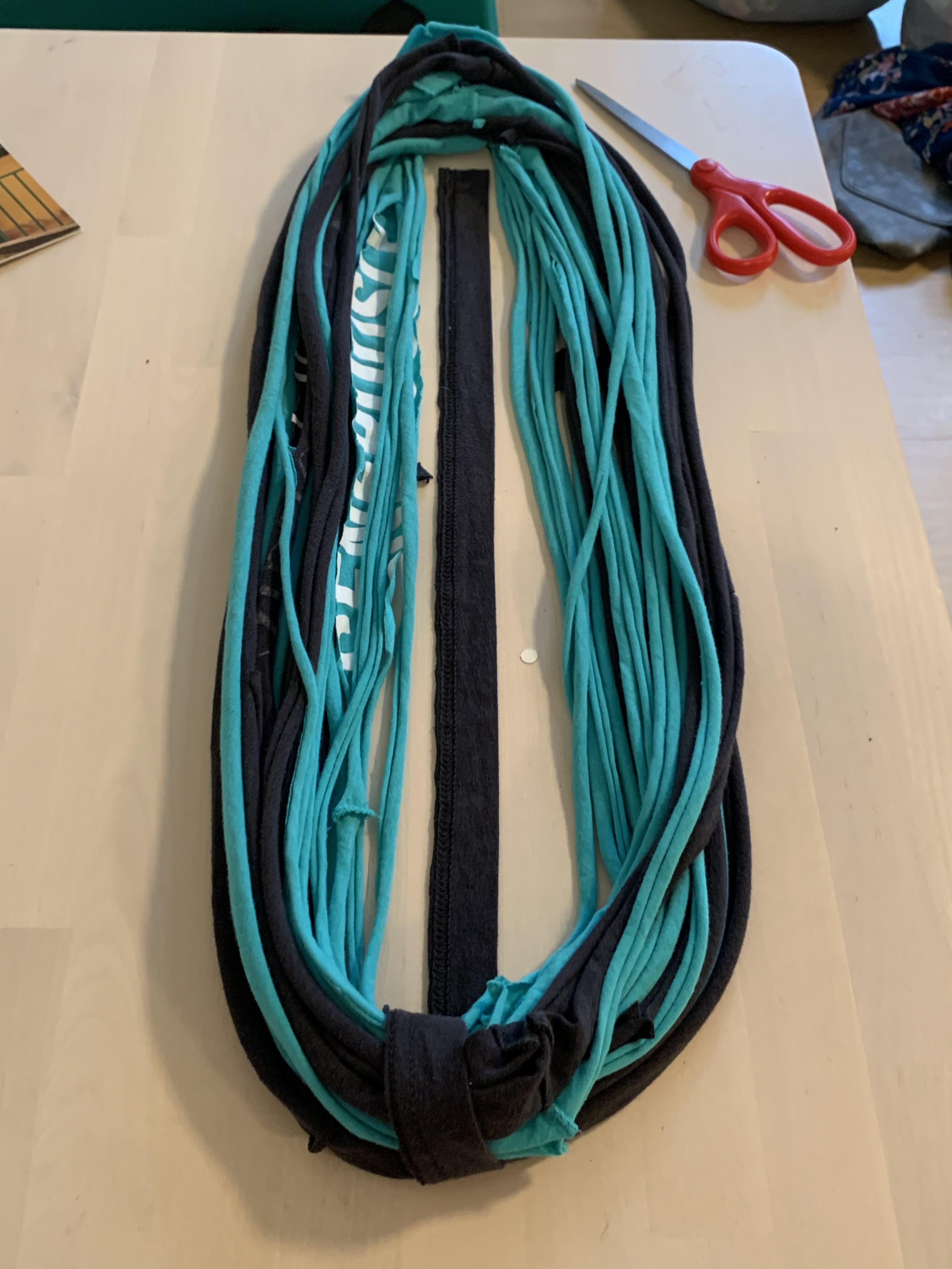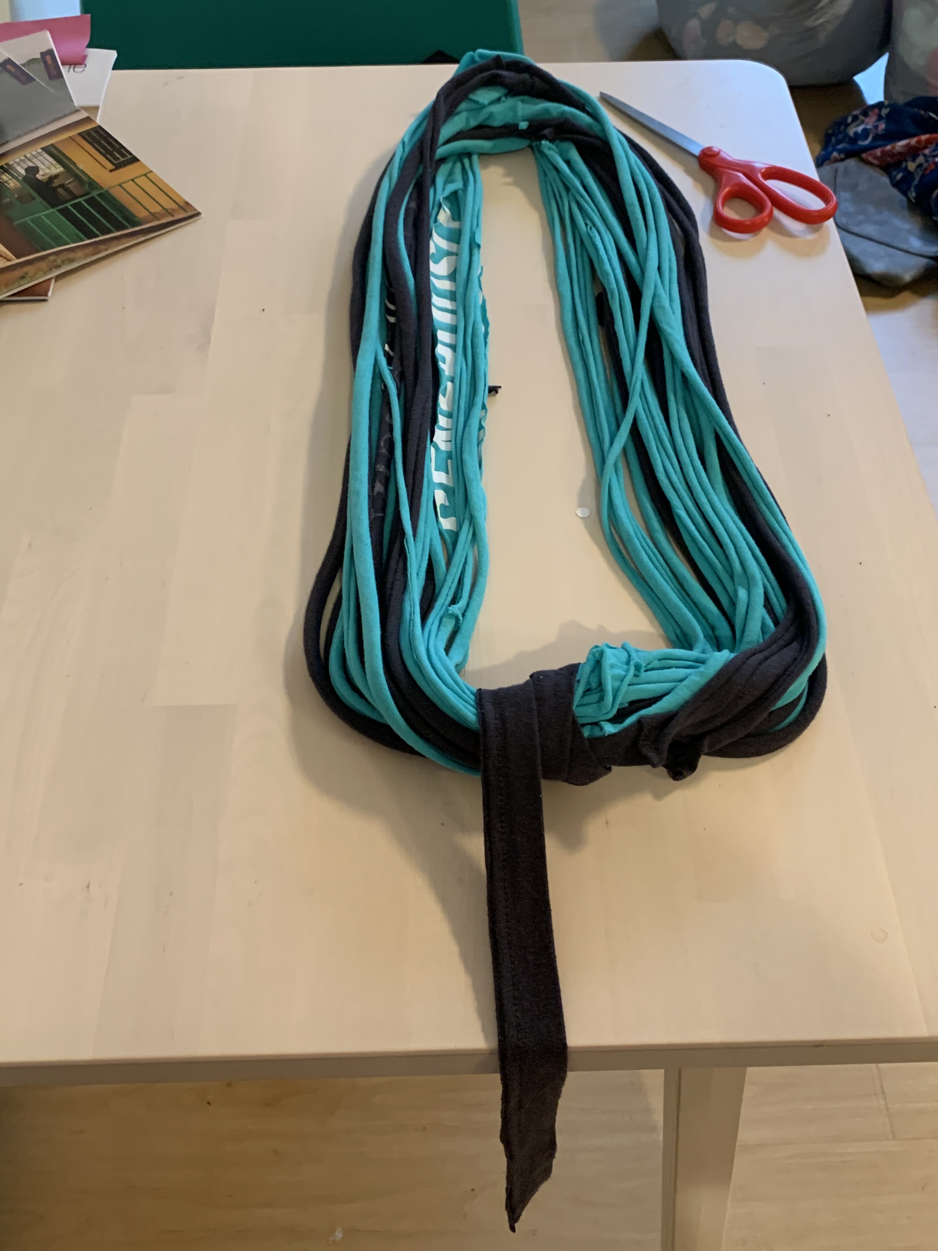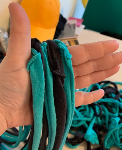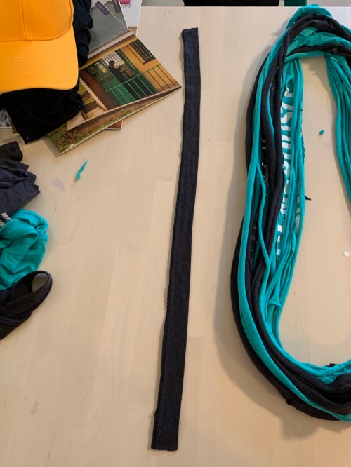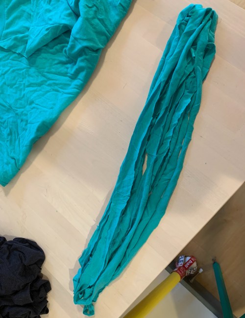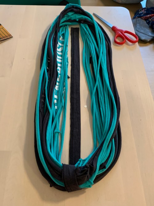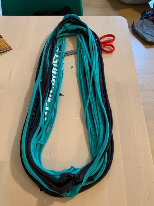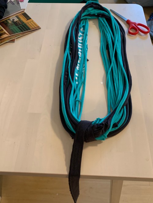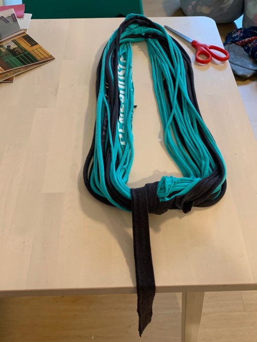 Once you’ve made yarn out of all the t-shirt strips you’ve made, it’s time to gather them and make a scarf.