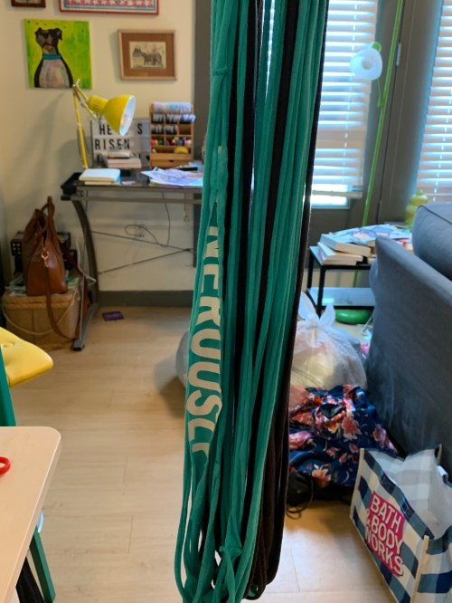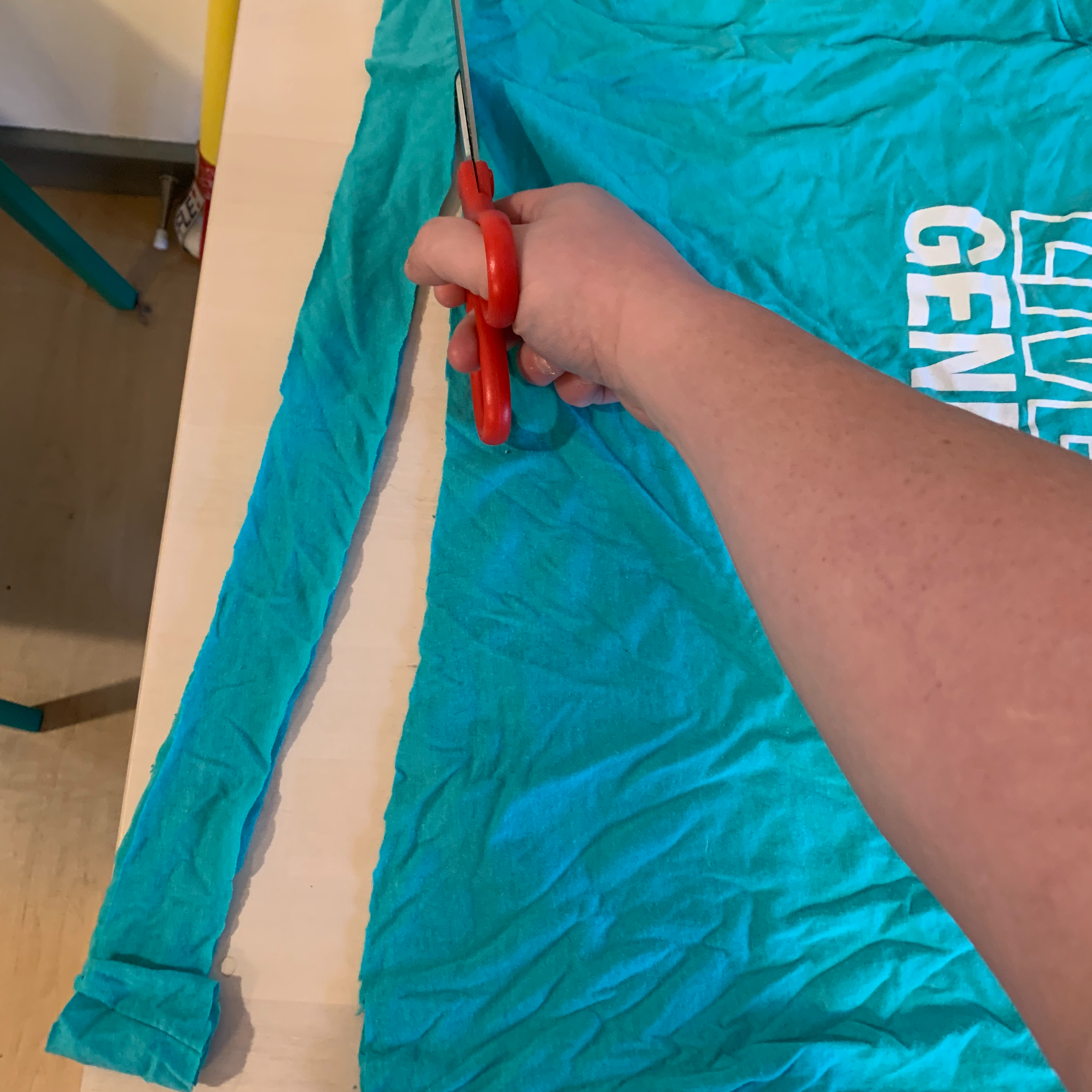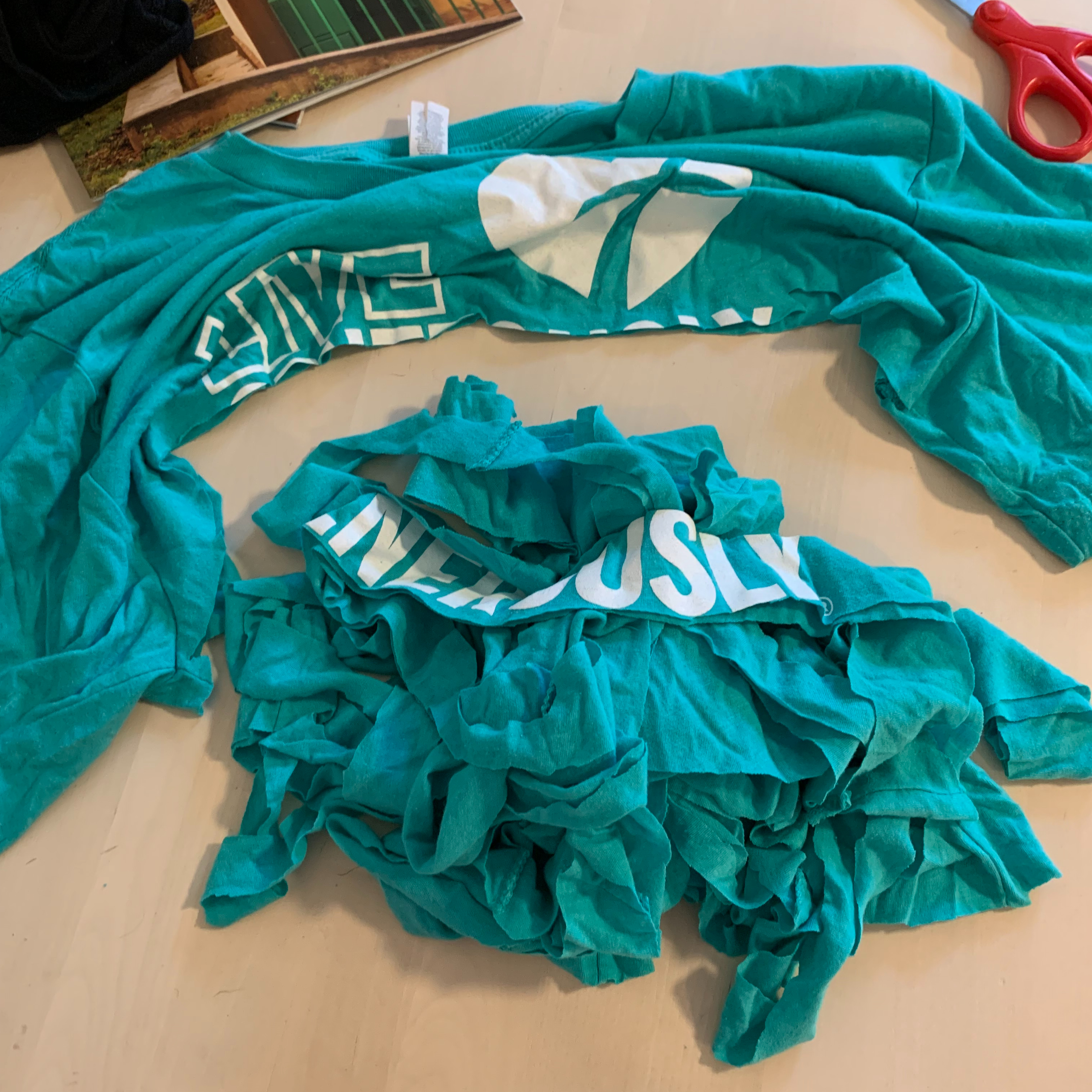 Above, you’ll see I cut strips up to the “armpits” of the shirt, which meant some of the “Live Generously” was on the yarn. I do not recommend this, as yarn strips with t-shirt printing on them will not curl appropriately. But whatever. She made it work anyway kind of.