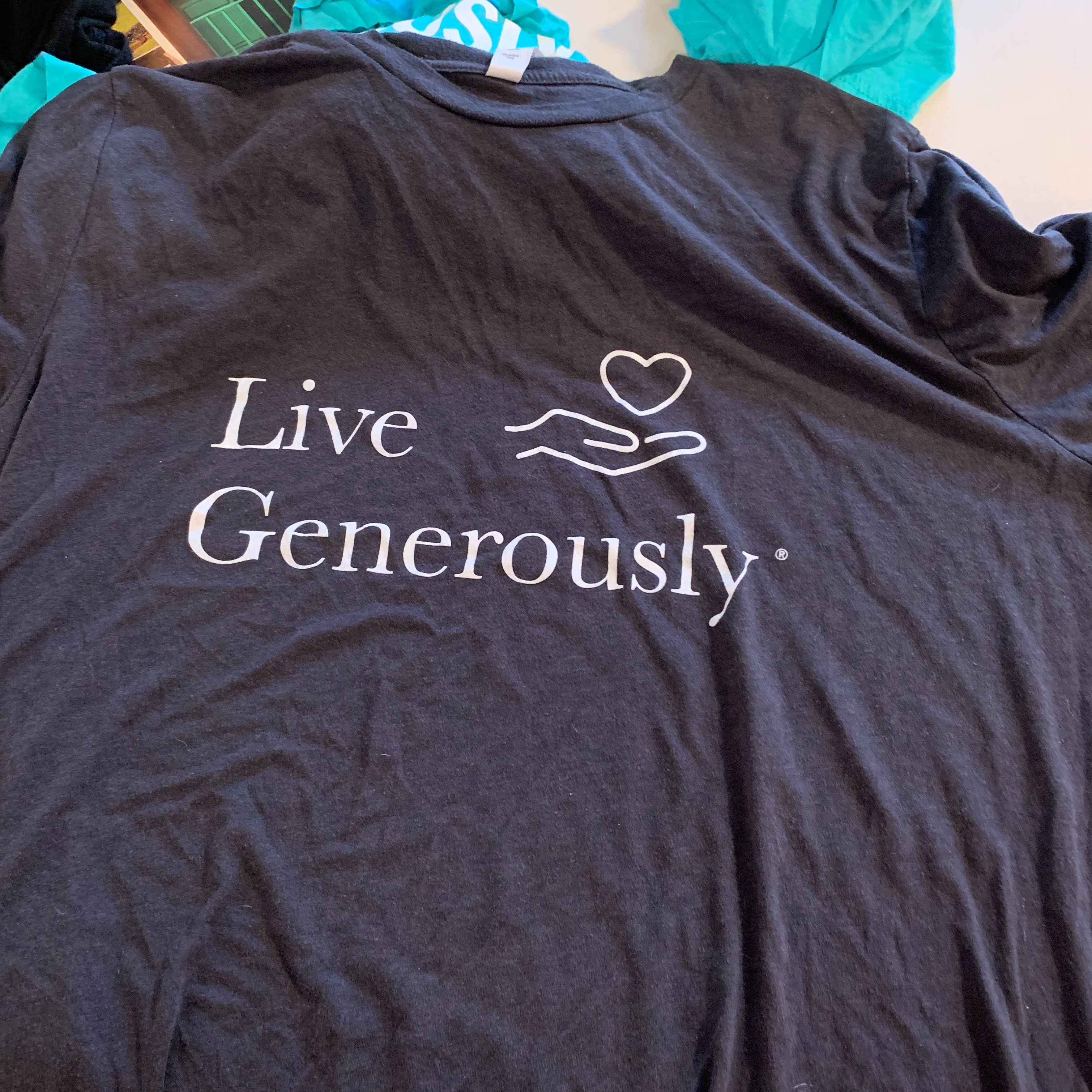 For those who are not familiar, these Live Generously t-shirts come from Thrivent. Thrivent has a product, Thrivent Action Teams, which issues grants to Thrivent members. In my own experience, Thrivent members use these grants to make a difference in their communities through service projects facilitated by their congregation. While I am not a Thrivent member, I have participated in a number of projects made possible by Thrivent Action Teams.