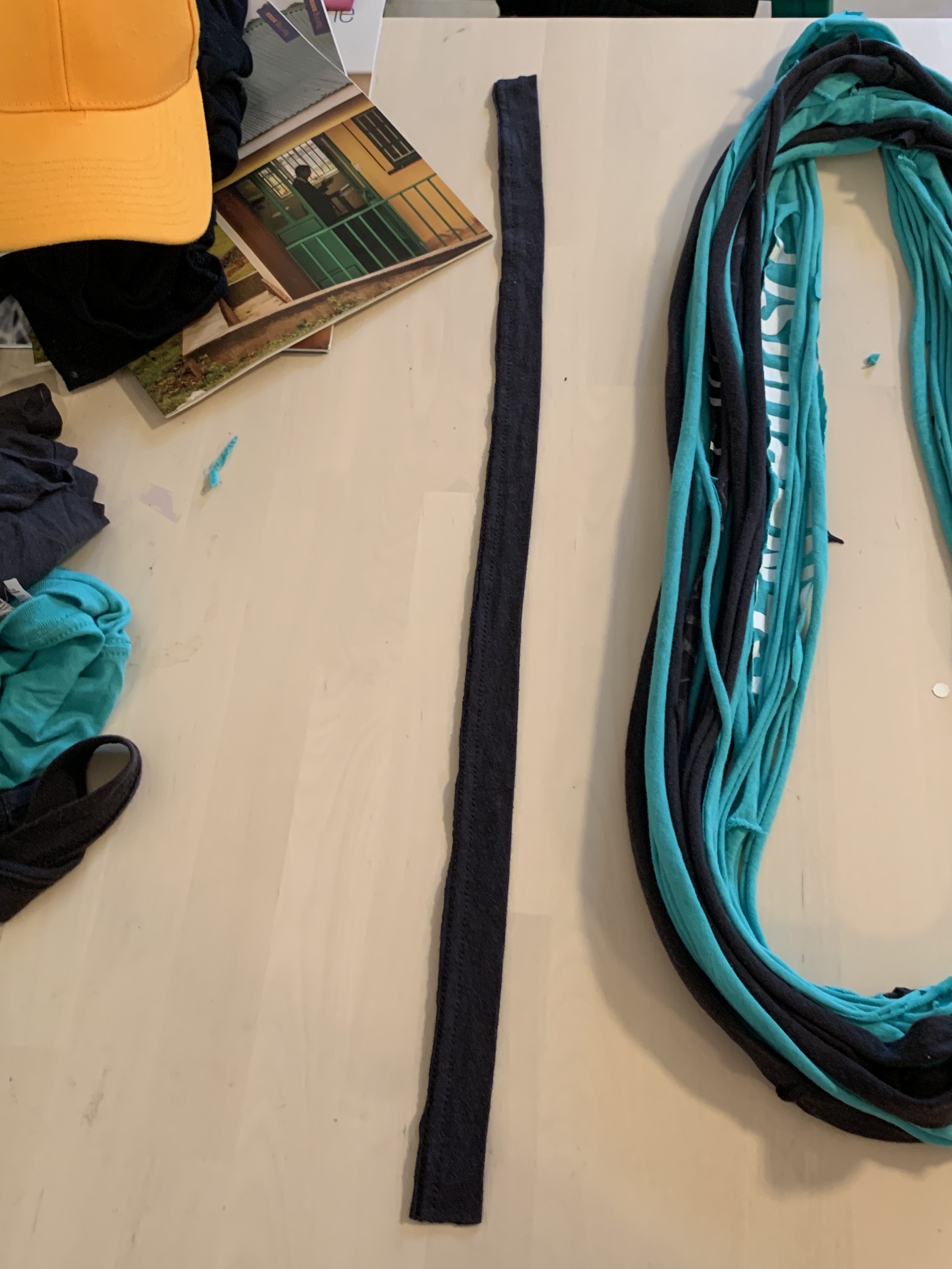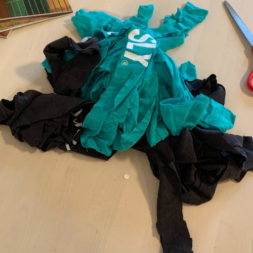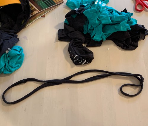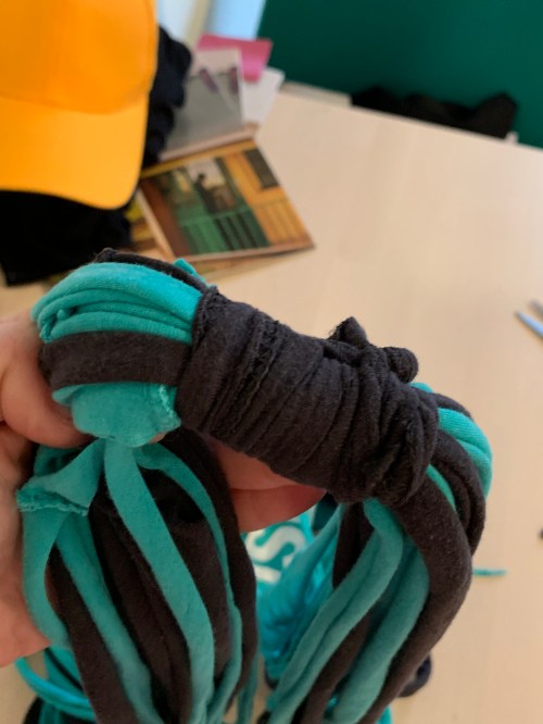 I saved the bottom seam of the black t-shirt to form the gathering point of the t-shirt yarn.