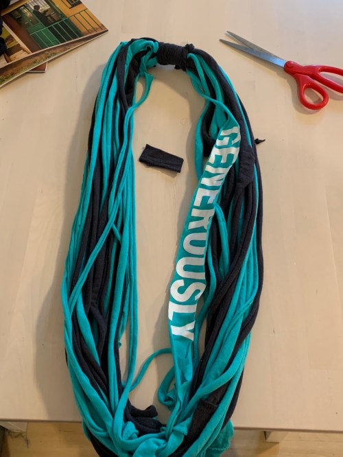 And voila. There’s your (unofficially licensed by) Thrivent “Live Generously” t-shirt infinity scarf.