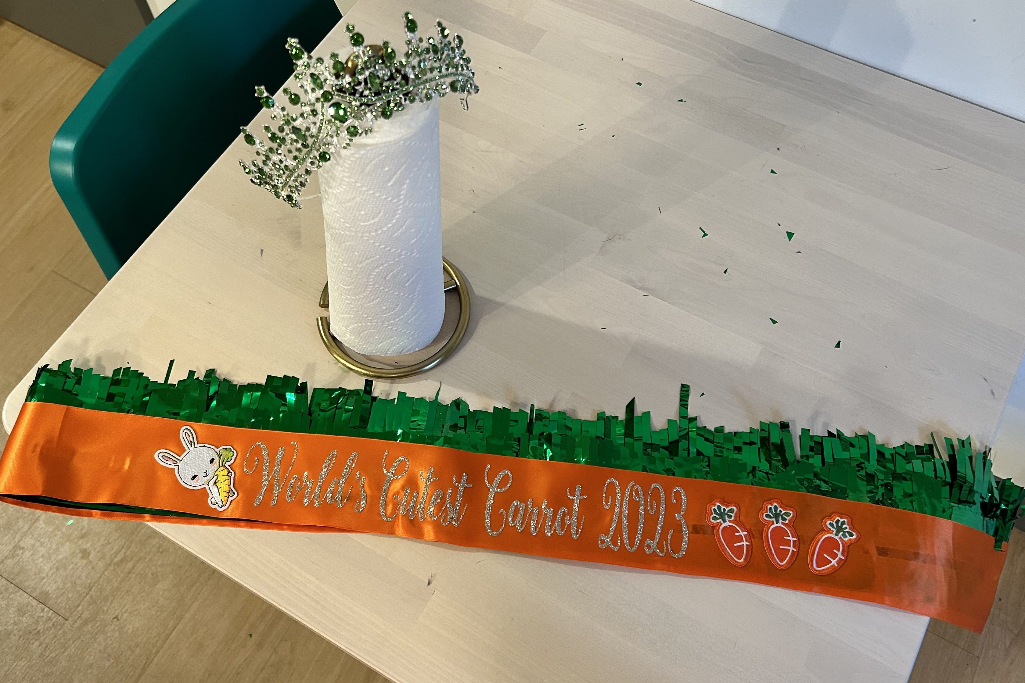 Also, I made this pageant sash yesterday. I think I’ll probably present it to the winner tonight. Look at me bein’ all crafty though. #worldscutestcarrot2023